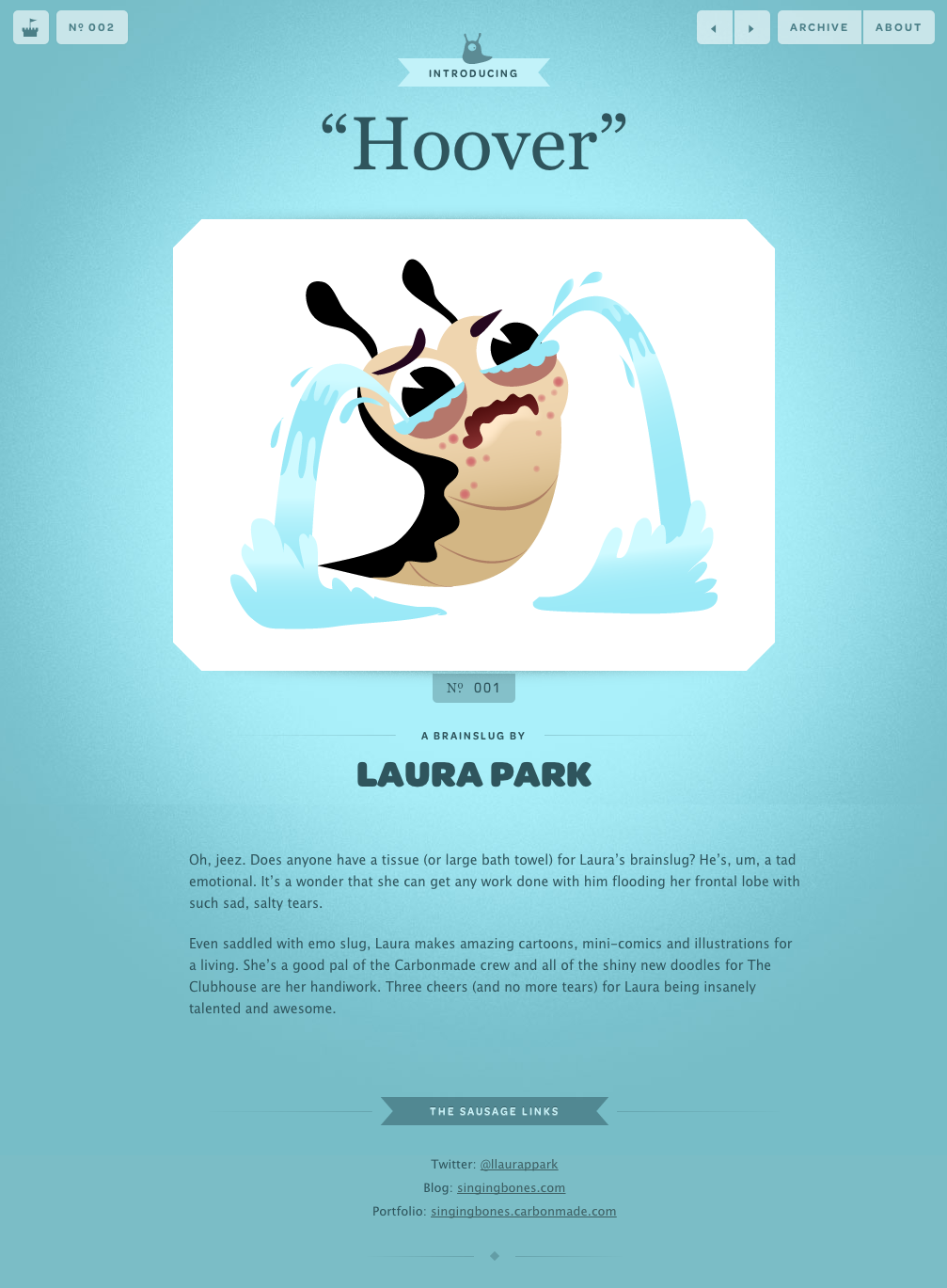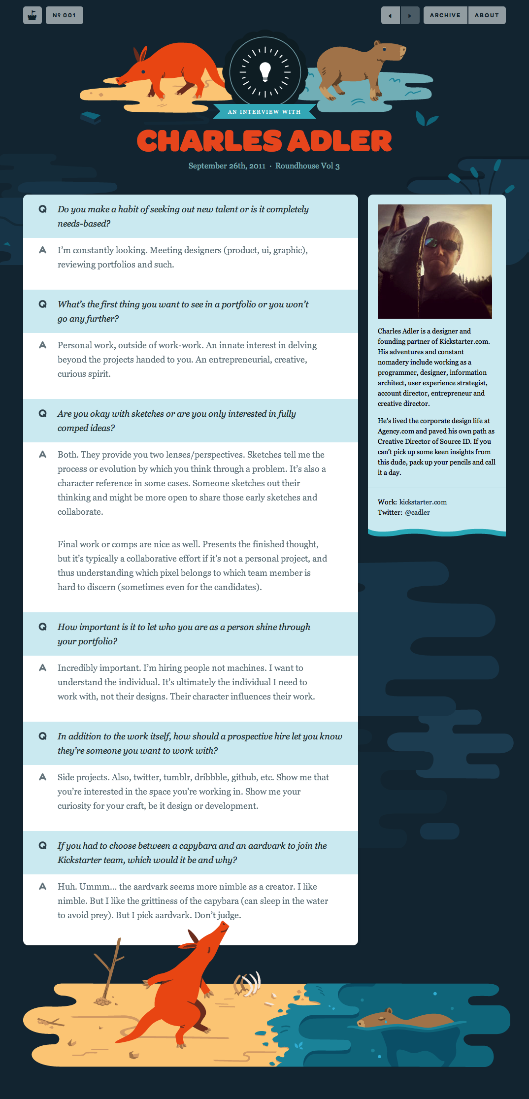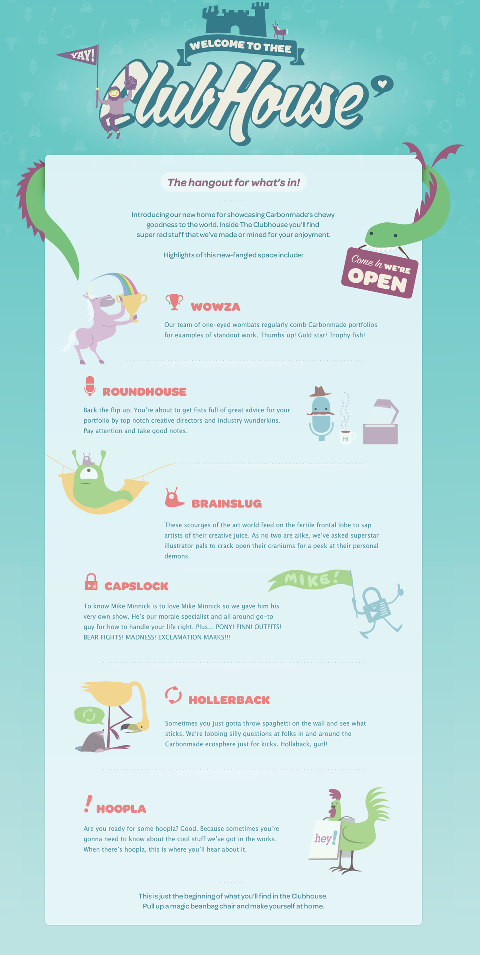 Carbonmade’s Creative Director tested out his two newest hires with a site-building exercise. He threw me and designer Timo Kuhn into a “room” and let us build a fun space together called The Clubhouse. It was a home for a variety of interviews, art projects, silliness and spotlights on our favourite Carbonmade users. It was a great way to figure out how to work together remotely while building something new and beautiful for our users. The end result even got featured in .net magazine.