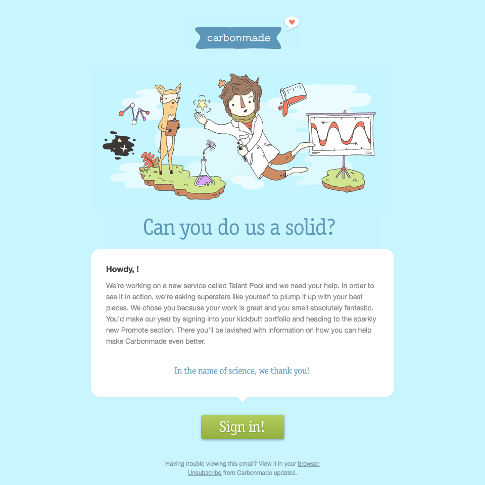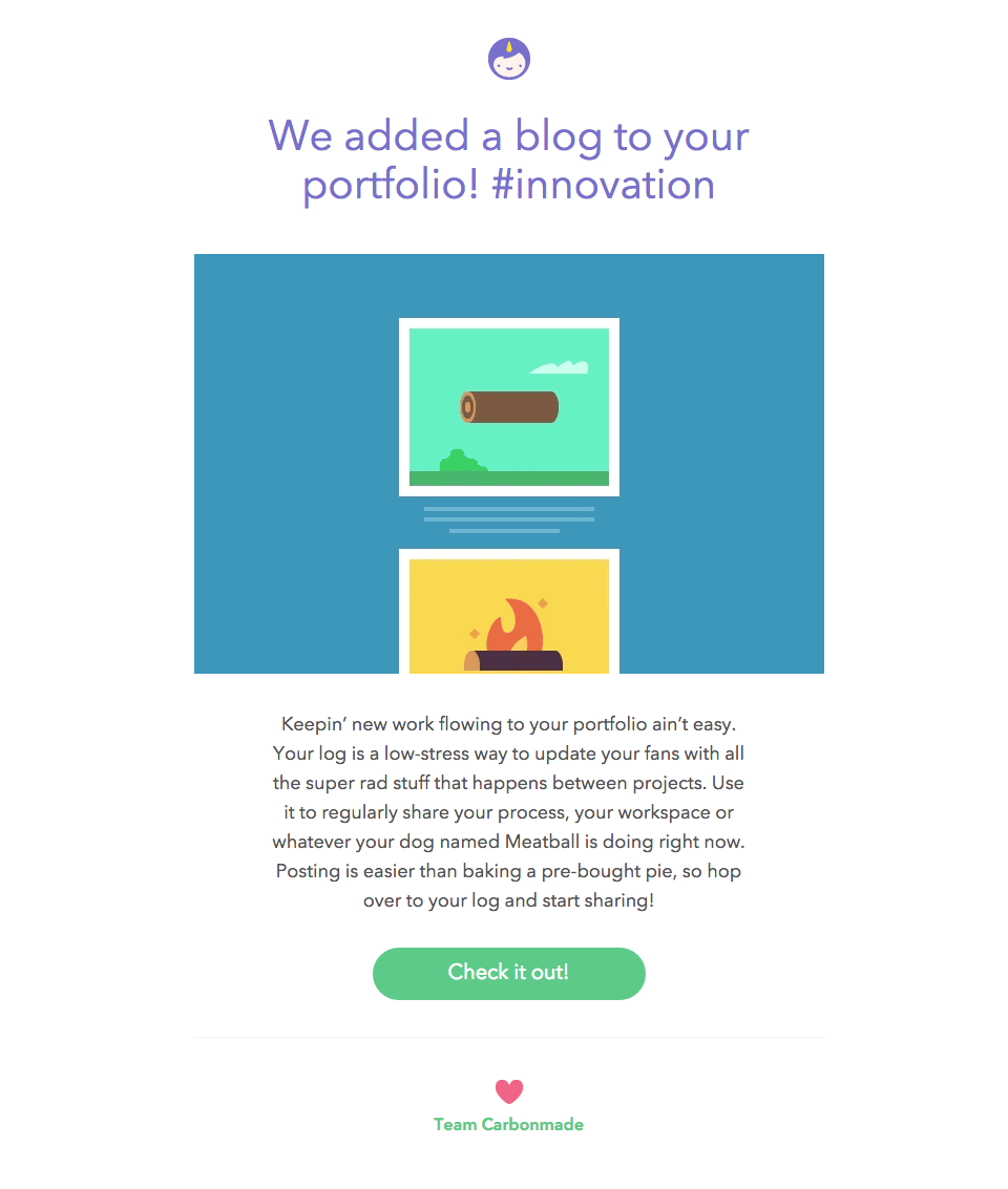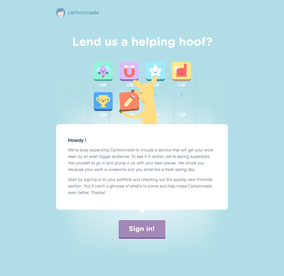 This is the very first email I ever wrote for Carbonmade. It was done as a freelance project and led to my being hired full-time as a remote worker at home in Canada. Dave appreciated that I could easily pick up the fun and folksy voice he crafted for the brand.