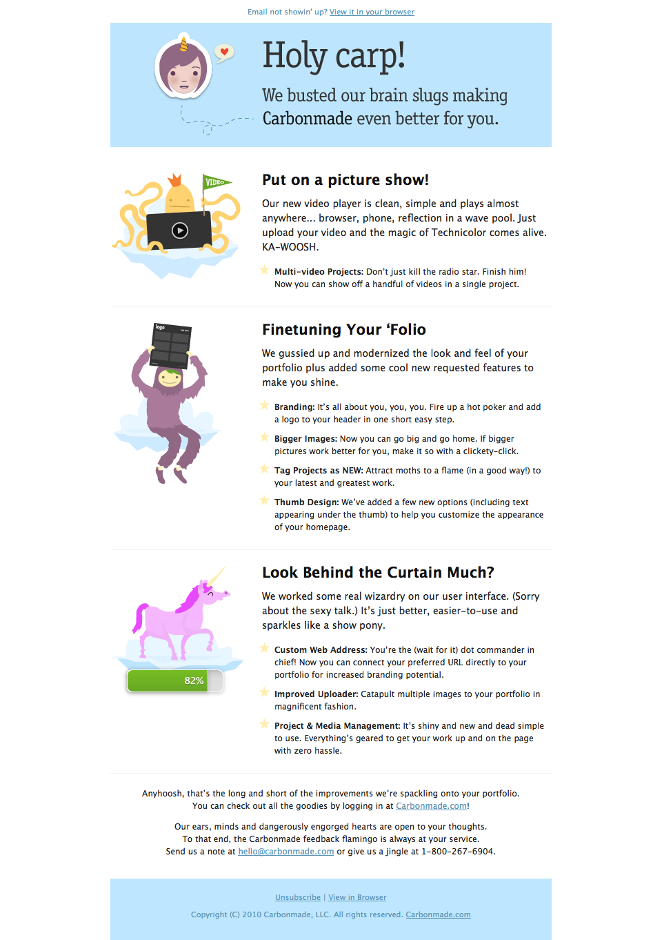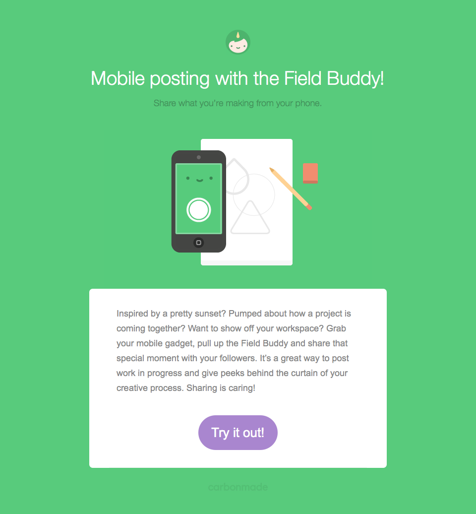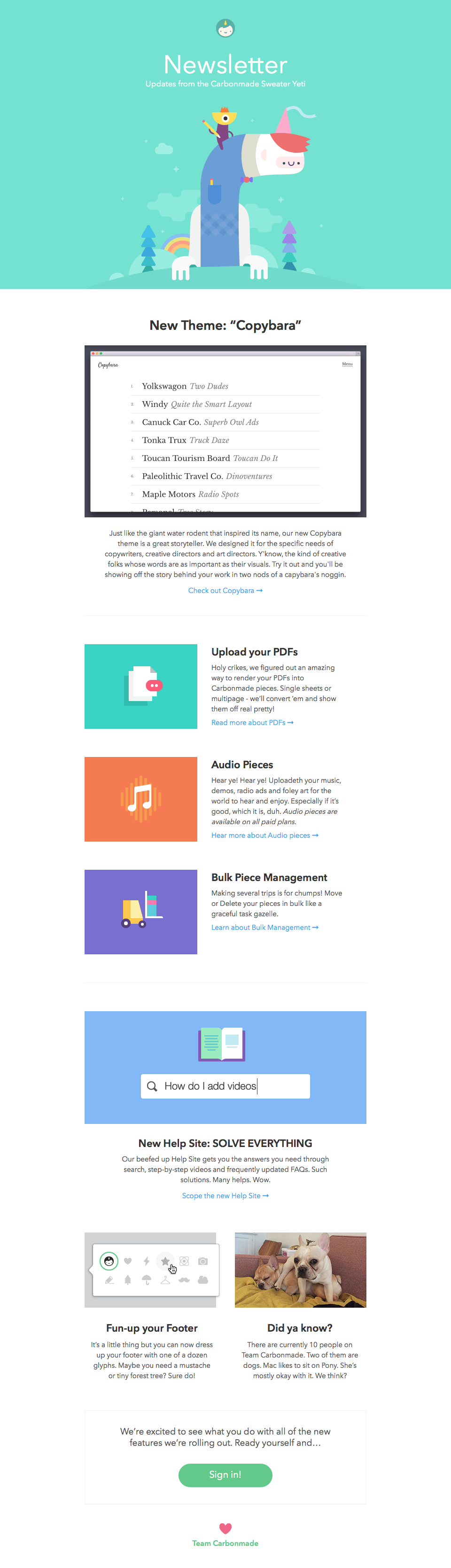 This is the very first email I ever wrote for Carbonmade. It was done as a freelance project and led to my being hired full-time as a remote worker at home in Canada. Dave appreciated that I could easily pick up the fun and folksy voice he crafted for the brand.